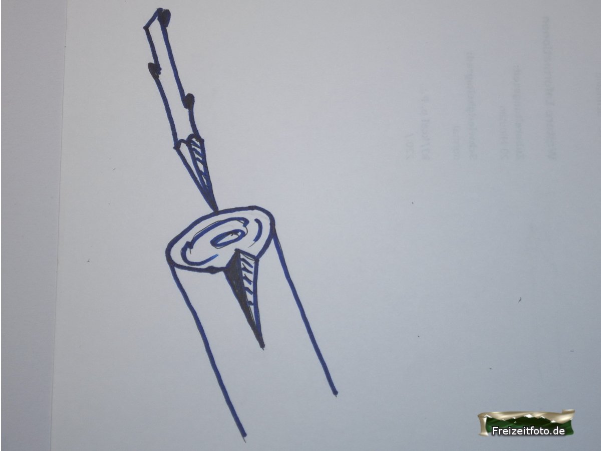 Die Geißfußpfropfung wird überall dort angewendet, wo der Pfropfkopf größer ist als der Reis. Das Reis wird mit zwei Kopulationsschnitten (3 – 4 cm lang) so angesetzt, das ein Geißfuß entsteht. Nun wird entsprechend des Geißfußes ein keilförmiger Ausschnitt am Pfropfkopf vorgenommen. Das Reis wird eingefügt, mit Bindematerial gebunden (um das Auge herum binden) und mit Baumwachs verstrichen.