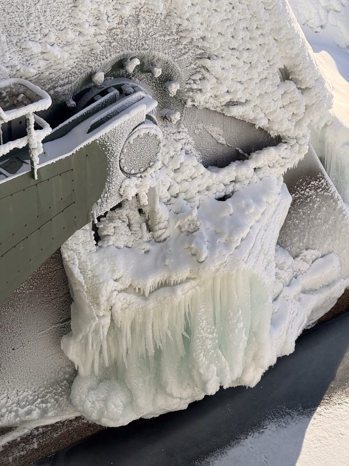 Die Vereisung an solchen Bauteilen ist im Winter in dieser Region keine Seltenheit. Trotz der extremen Bedingungen ist das Kraftwerk so konstruiert, dass es auch bei starkem Frost zuverlässig arbeiten kann.