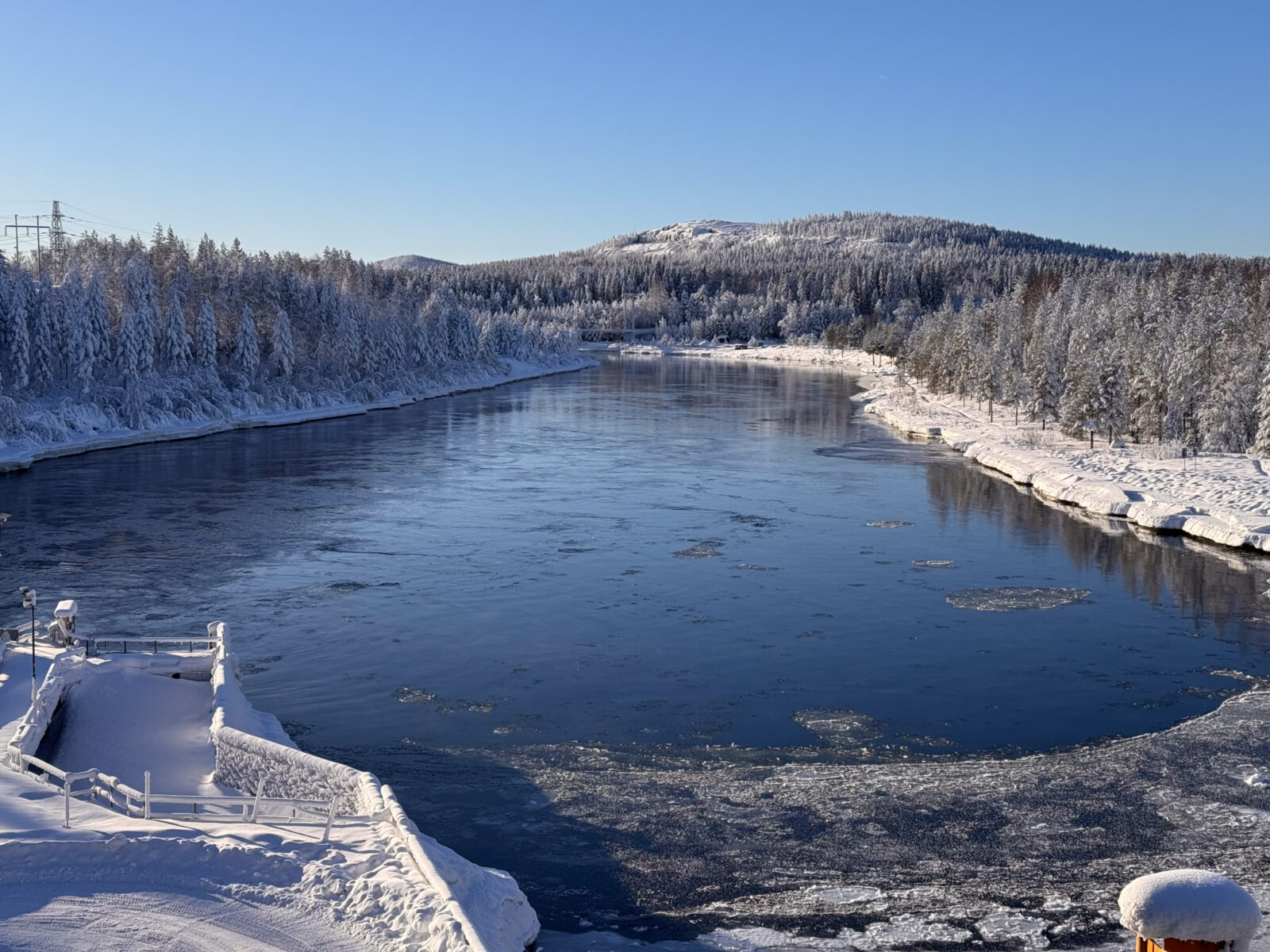 Von der oberen Seite des Damms hat man einen eindrucksvollen Blick flussabwärts entlang des Lule älv. Gerade im Winter wirkt die Landschaft besonders beeindruckend: Schnee bedeckt die Ufer, und der Fluss bildet eine klare Linie durch die nordschwedische Natur.