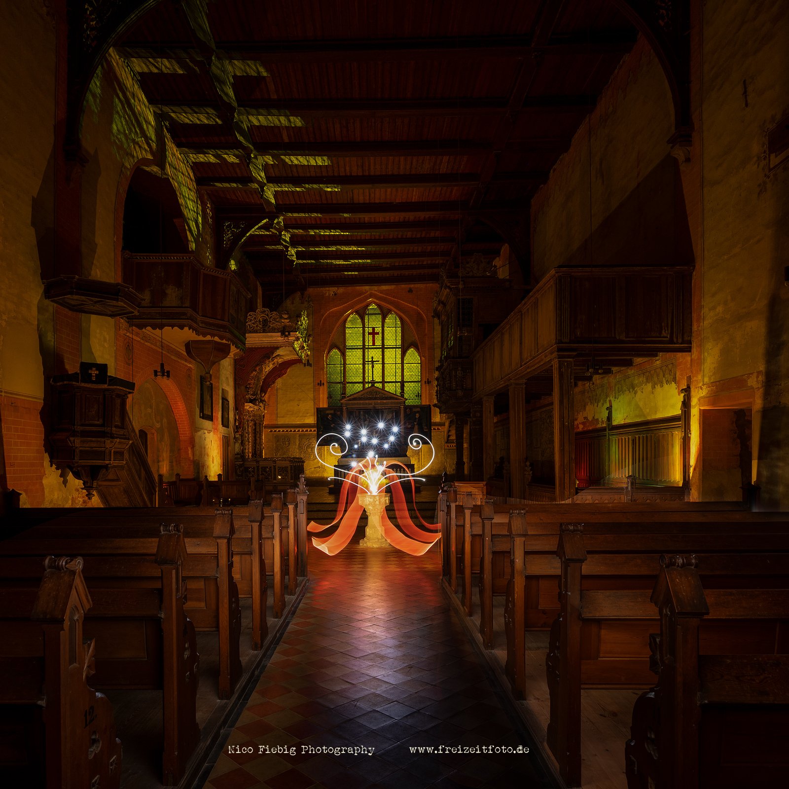 Der Taufstein vor dem Altar bildete den zentralen Punkt für das Lightpainting. Unser Ziel war es, eine Lichtform darüber zu erschaffen, die Energie ausdrückt und trotz der schönen Umgebung einen zentralen Punkt für den Betrachter schafft.