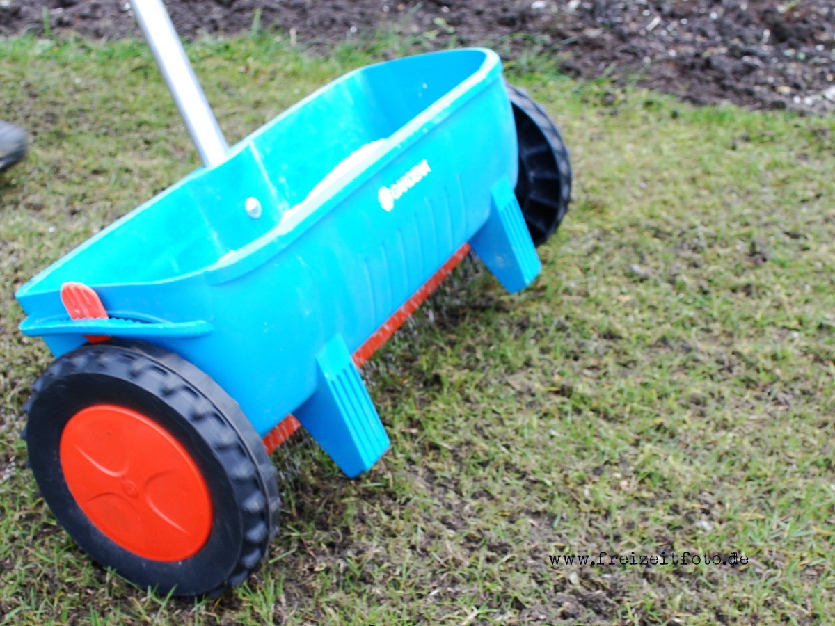 Zu guter Letzt ist das Düngen eine wichtige Pflegemaßnahme. Die Bodenaktivität wird verbessert, indem eine dünne Schicht feingesiebter Kompost auf die Rasenfläche verteilt wird. Eine Bodenprobe hilft den pH-Wert zu überprüfen, er sollte bei 7,0 liegen. Eine notwendige Düngergabe im Frühjahr mit Stickstoff und im Herbst mit Kalium wird mit einem Streuwagen gleichmäßig verteilt.