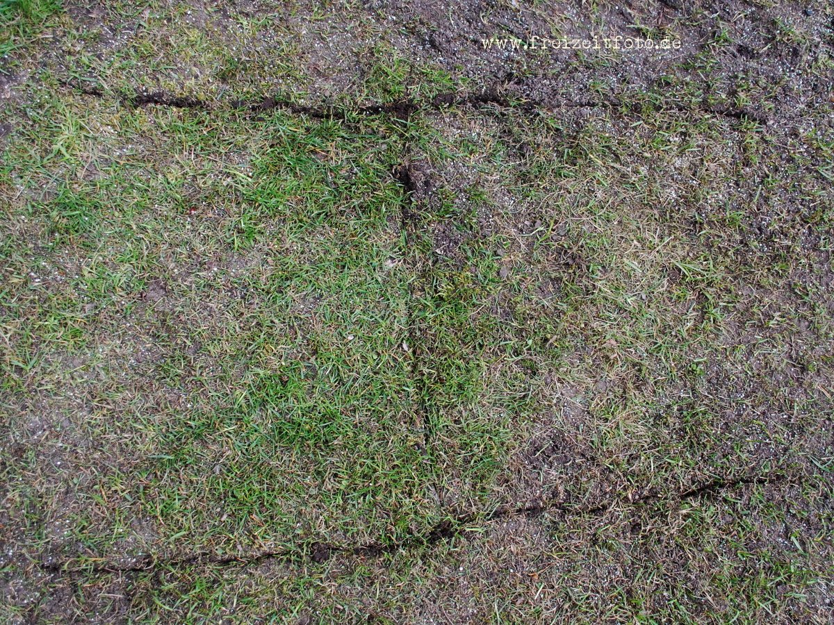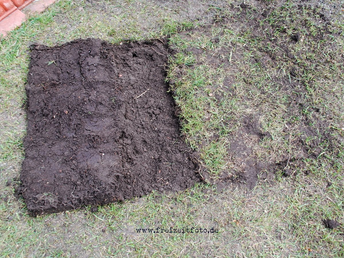 Eine Vertiefung im Rasen wird aufgefüllt indem mit dem Spaten ein „H“ eingestochen wird. Mit dem Spaten werden die beiden Rasenhälften vorsichtig aufgeklappt, mit Erde das Loch aufgefüllt und anschließend die Rasenhälften wieder zurück geklappt.